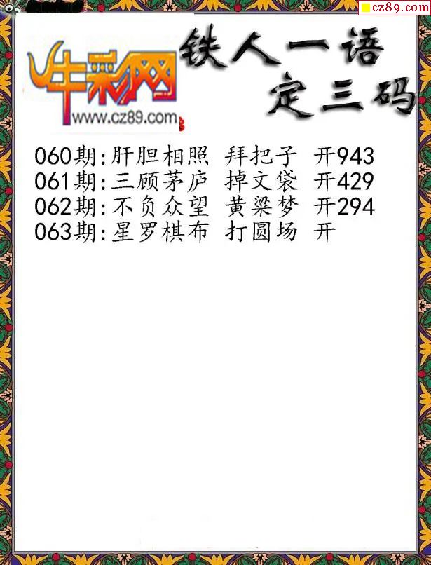 > 福彩3D2026063期铁人一句定三码字图谜